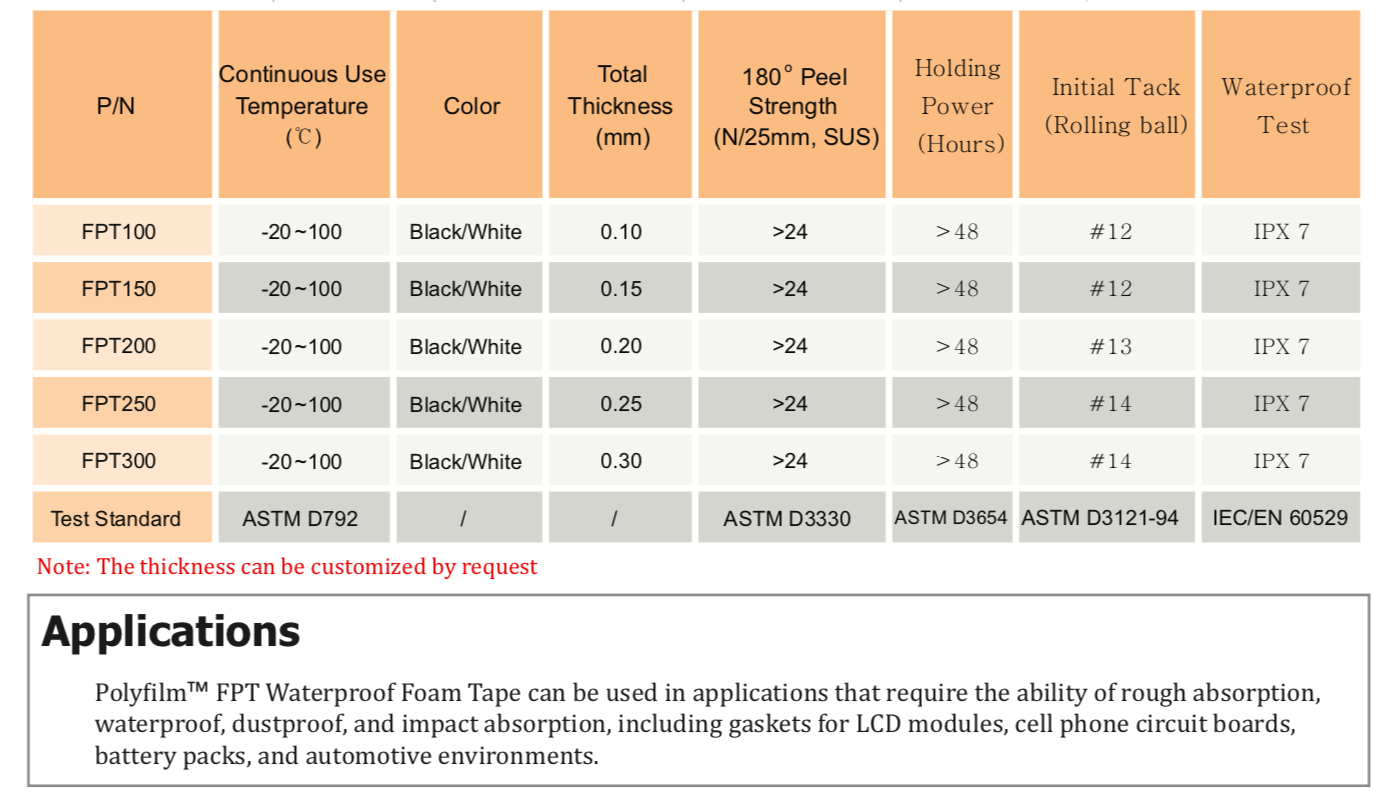 TM FPT 系列泡棉膠帶是一種雙面膠帶,由特定的聚乙烯泡棉和丙烯酸粘合劑組成。這種防水泡棉膠帶由于其微觀和獨(dú)立的細(xì)胞結(jié)構(gòu)而非常薄和柔軟。它具有高的沖擊吸收能力、出色的防水性能和回彈性。" />